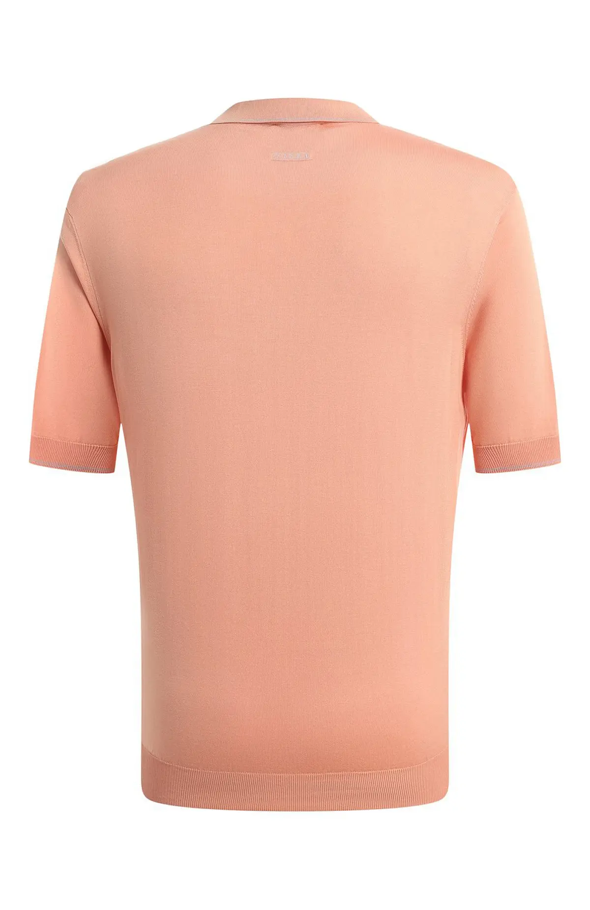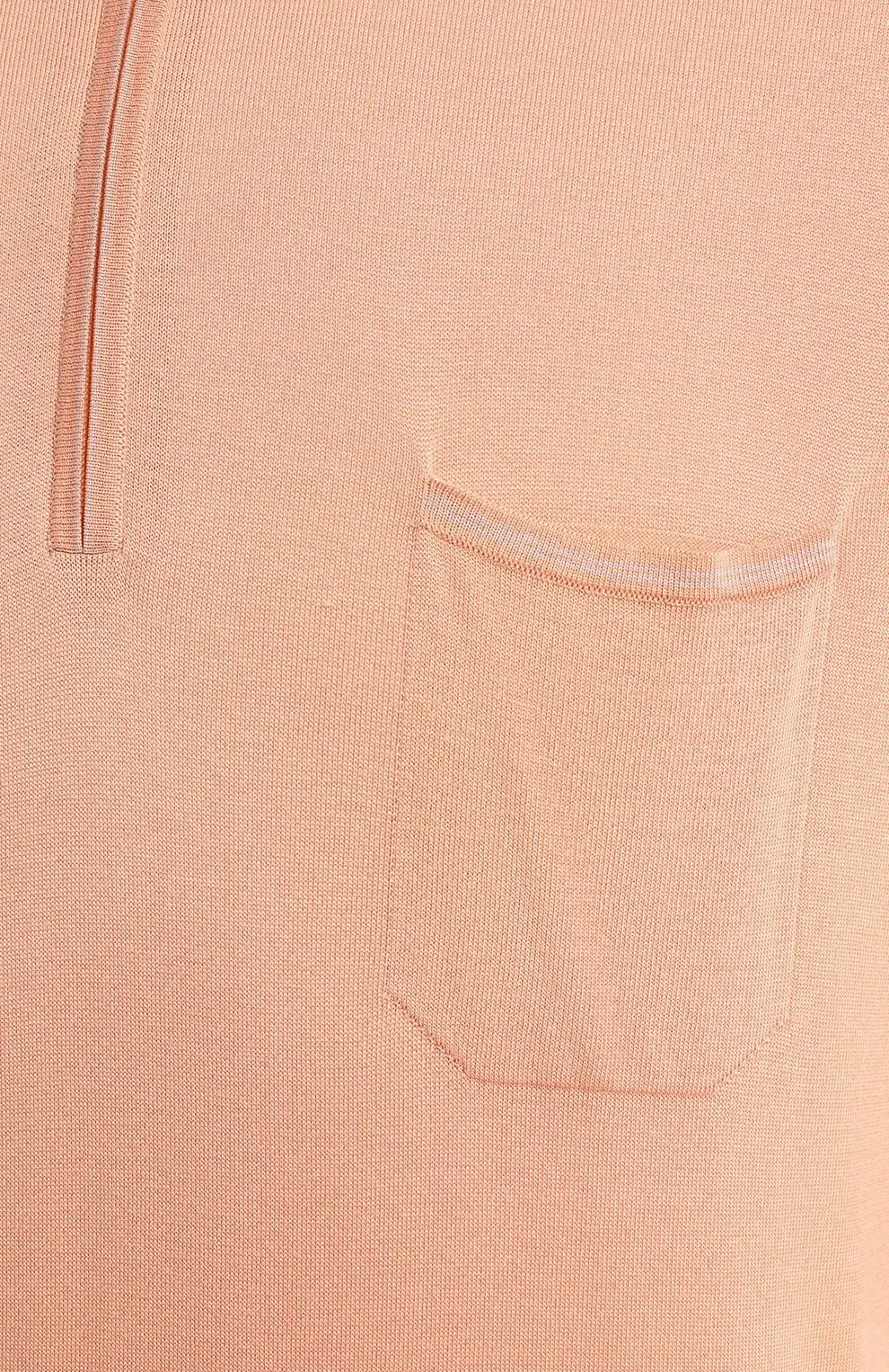 Шелковое поло Zilli выполнено в мягком персиковом оттенке, подчеркивающем утончённость стиля бренда. Модель из чистого шелка отличается деликатным блеском и приятной текстурой. Классический воротник, короткие рукава и застёжка-молния придают изделию современный характер, а нагрудный карман добавляет ненавязчивую элегантность. Идеальный выбор для летнего гардероба с акцентом на роскошь в деталях.